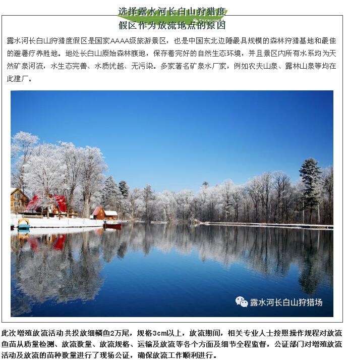 由撫松縣水利局主辦,撫松縣漁政漁港監(jiān)督管理站承辦“2018年撫松縣水生生物增殖放流活動(dòng)”工作組,在11月3日,來到了露水河長白山狩獵度假區(qū)組織開展了水生生物增殖放流活動(dòng)。